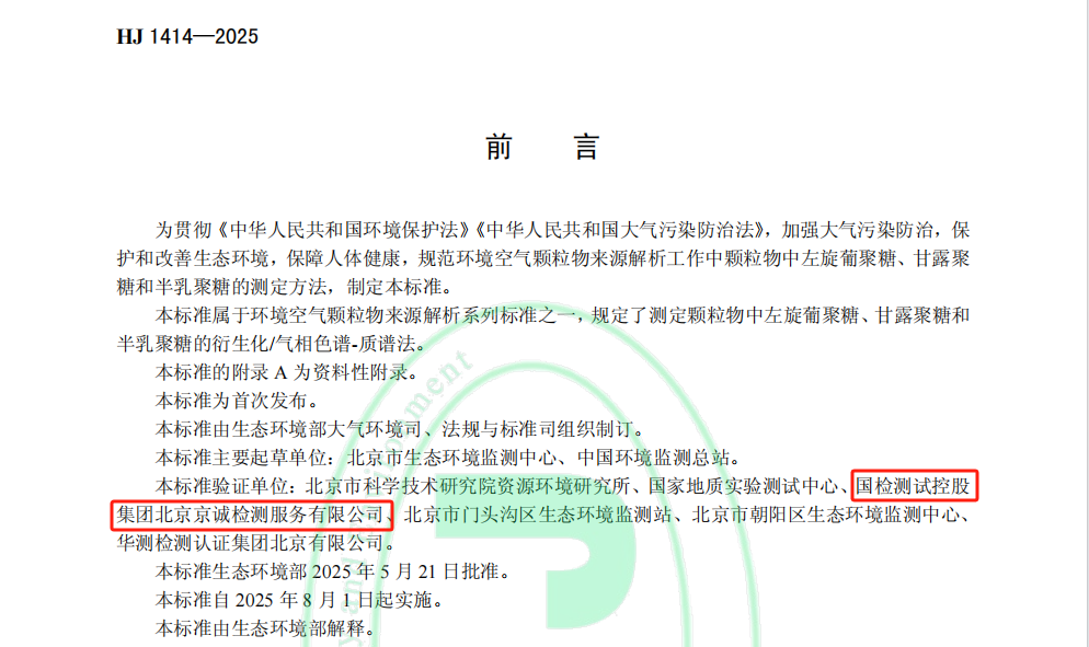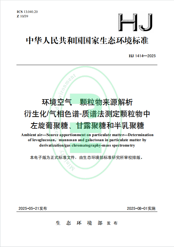 近日,國檢京誠參與編制的國家生態(tài)環(huán)境標準《環(huán)境空氣 顆粒物來源解析 衍生化/氣相色譜-質(zhì)譜法測定顆粒物中左旋葡聚糖、甘露聚糖和半乳聚糖》(HJ 1414-2025)正式發(fā)布。該份標準將于2025年8月1日正式實施,將為規(guī)范環(huán)境空氣顆粒物來源解析工作中左旋葡聚糖、甘露聚糖和半乳聚糖的檢測提供重要的技術(shù)依據(jù)。