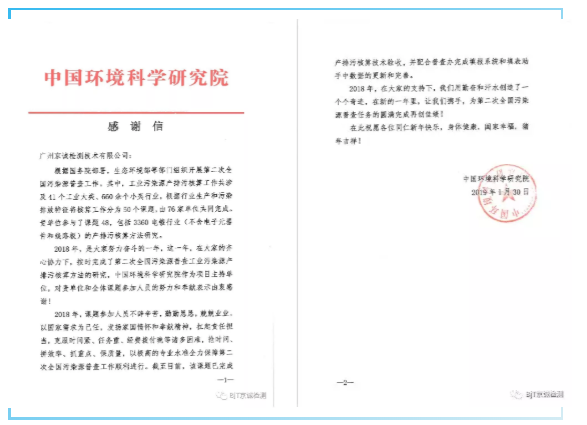 中國環(huán)境科學(xué)研究院致信京誠檢測集團(tuán),對我集團(tuán)2018年度在全國第二次污染源普查項(xiàng)目工業(yè)污染源產(chǎn)排污核算工作中全體參與人員的努力和奉獻(xiàn)表示由衷感謝。
