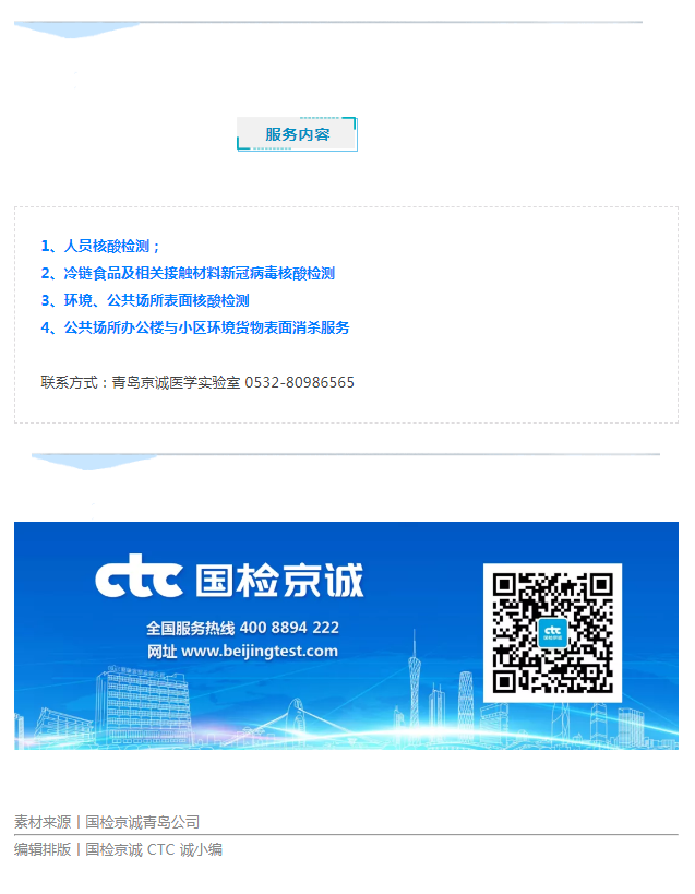 國檢京誠青島醫(yī)學(xué)實驗室擁有先進(jìn)的生物安全二級實驗室,憑借豐富的經(jīng)驗、出色的效率、先進(jìn)的設(shè)備,不僅提供人、食品、食品接觸表面、食品冷鏈、環(huán)境的核酸檢測,同時拓展業(yè)務(wù)領(lǐng)域,具備公共環(huán)境消毒服務(wù)資質(zhì),可對冷庫倉儲場所、學(xué)校、幼兒園、商場、影劇院、地鐵站、機(jī)場等各種公共場所提供消殺滅菌等一站式專業(yè)服務(wù),充分利用自身業(yè)務(wù)優(yōu)勢,形成戰(zhàn)疫強(qiáng)力,為疫情防控提供持續(xù)助力!