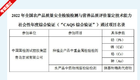 農業(yè)農村部農產品質量安全中心(簡稱“國家農安中心”)組織開展了2022年全國農產品質量安全檢驗檢測與營養(yǎng)品質評價鑒定技術能力社會性年度綜合驗證(“CAQS綜合驗證”),國檢京誠集團參加的水產品中藥物殘留、種植業(yè)產品中重金屬檢驗檢測項目均取得“考核合格”的評價!