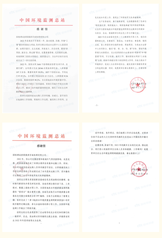 2023年1月11日,中國環(huán)境監(jiān)測總站致信國檢京誠集團,對集團配合總站水運管中心落實各項部署安排,有力保障了國家水網(wǎng)穩(wěn)定、高質(zhì)量運行,為全年目標任務完成作出的貢獻表示感謝。