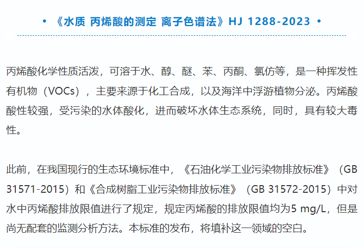 近日,國檢京誠青島公司參與驗證的生態(tài)環(huán)境標準《水質(zhì) 甲基汞和乙基汞的測定 液相色譜-原子熒光法》HJ 1268-2022正式發(fā)布,于2023年6月15日正式實施;國檢京誠廣州公司和北京公司參與驗證的《水質(zhì) 丙烯酸的測定 離子色譜法》HJ 1288-2023正式發(fā)布,于2023年8月1日正式實施。