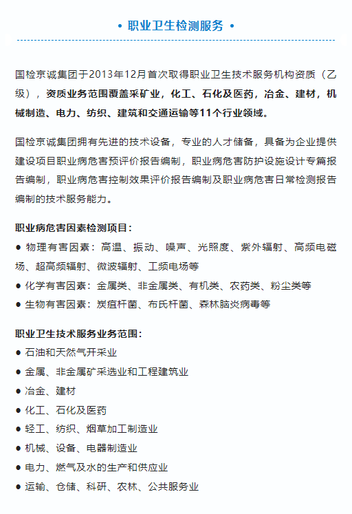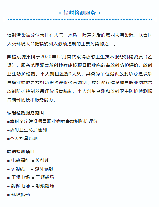 國檢京誠集團(tuán)擁有職業(yè)衛(wèi)生技術(shù)服務(wù)機(jī)構(gòu)資質(zhì)(乙級(jí))、放射衛(wèi)生技術(shù)服務(wù)機(jī)構(gòu)資質(zhì)(乙級(jí)),長期為政府機(jī)關(guān)、衛(wèi)生健康主管部門、疾控中心、企事業(yè)單位提供公共場(chǎng)所衛(wèi)生、職業(yè)衛(wèi)生、放射衛(wèi)生監(jiān)測(cè)等服務(wù)。