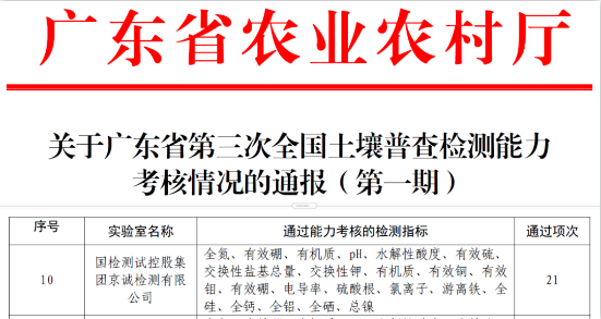 日前,農(nóng)業(yè)農(nóng)村部耕地質(zhì)量監(jiān)測(cè)保護(hù)中心、部分省市三普辦公室通報(bào)了2022年第三次全國(guó)土壤普查檢測(cè)能力驗(yàn)證考核結(jié)果,國(guó)檢京誠(chéng)集團(tuán)廣州公司、青島公司、陜西公司,以及國(guó)檢集團(tuán)廈門(mén)宏業(yè)公司順利通過(guò)能力驗(yàn)證考核。